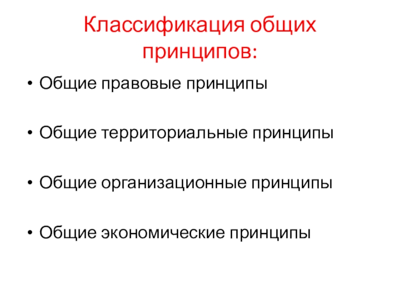 Классификация общих принципов:Общие правовые принципы Общие территориальные принципыОбщие организационные принципыОбщие экономические принципы