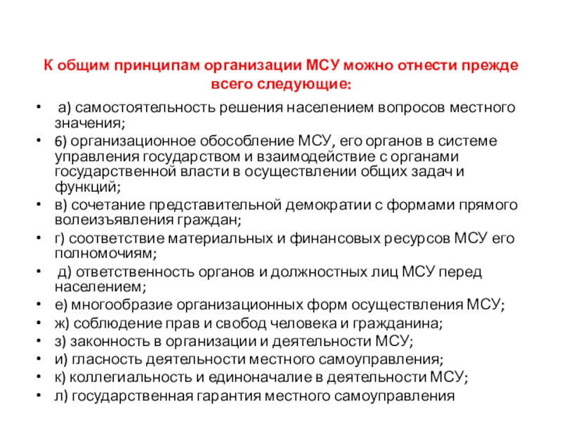 Слайд 8К общим принципам организации МСУ можно отнести прежде всего следующие: