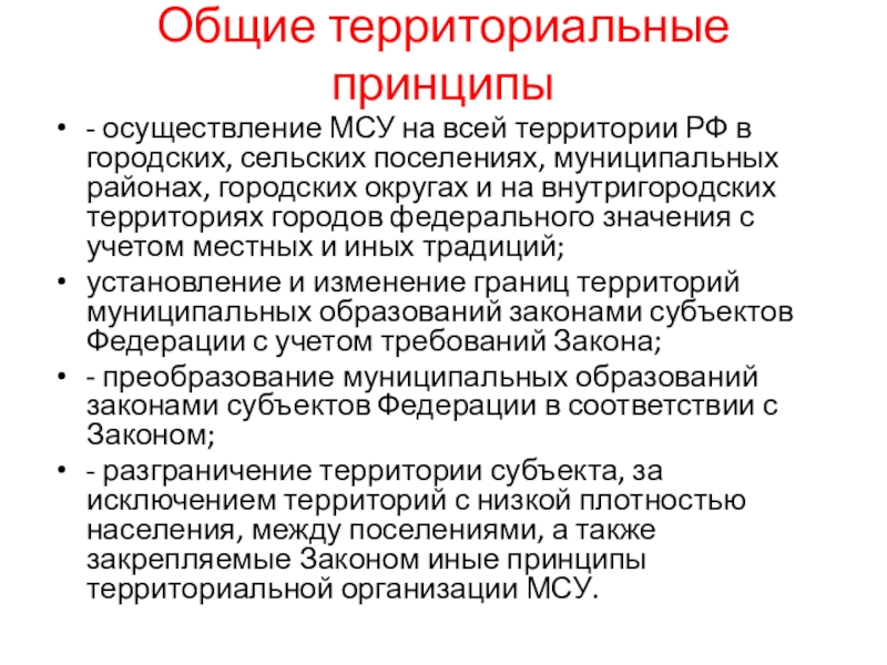 Общие территориальные принципы - осуществление МСУ на всей территории РФ в городских, сельских поселениях, муниципальных районах, городских
