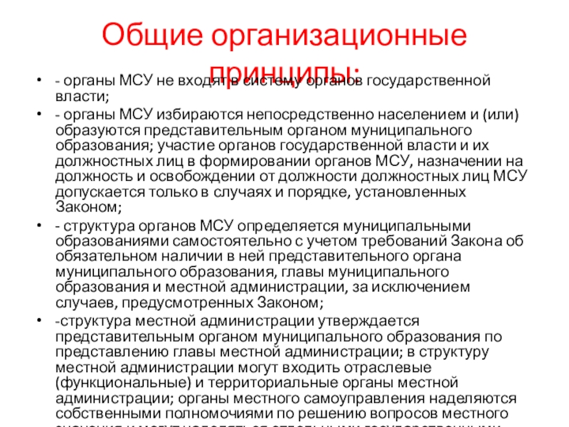 Общие организационные принципы:- органы МСУ не входят в систему органов государственной власти;- органы МСУ избираются непосредственно населением