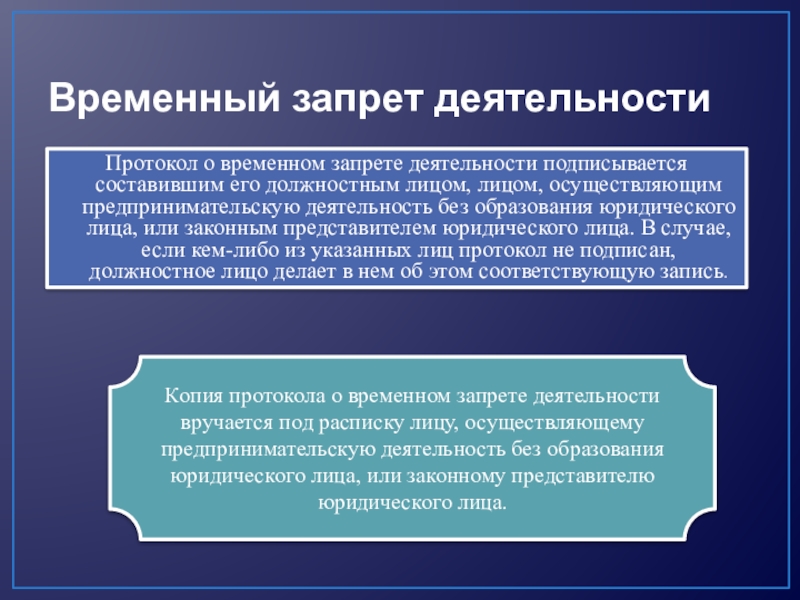 Копия протокола о временном запрете деятельности вручается под расписку лицу, осуществляющему предпринимательскую деятельность без образования юридического лица, или законному представителю юридического лица.