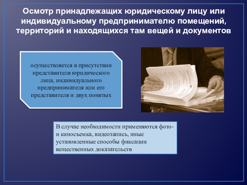 осуществляется в присутствии представителя юридического лица, индивидуального предпринимателя или его представителя и двух понятых