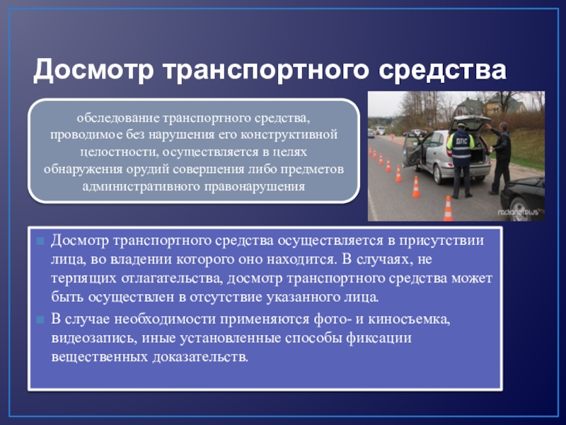 Досмотр транспортного средства осуществляется в присутствии лица, во владении которого оно находится. В случаях, не терпящих отлагательства, досмотр транспортного средства может быть осуществлен в отсутствие указанного лица.