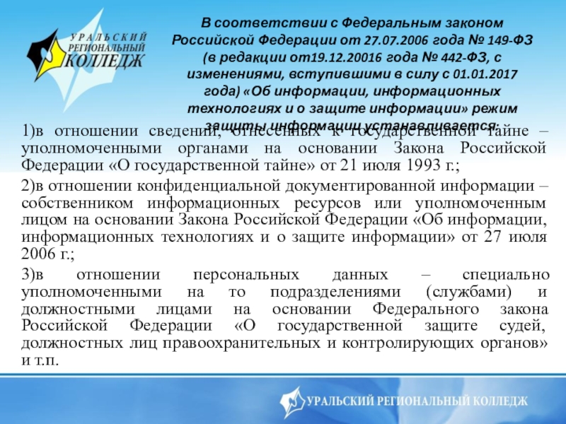 В соответствии с Федеральным законом Российской Федерации от 27.07.2006 года № 149-ФЗ (в редакции от19.12.20016 года № 442-ФЗ, с изменениями, вступившими в силу с 01.01.2017 года) «Об информации, информационных технологиях и о защите информации» режим защиты информации устанавливается: