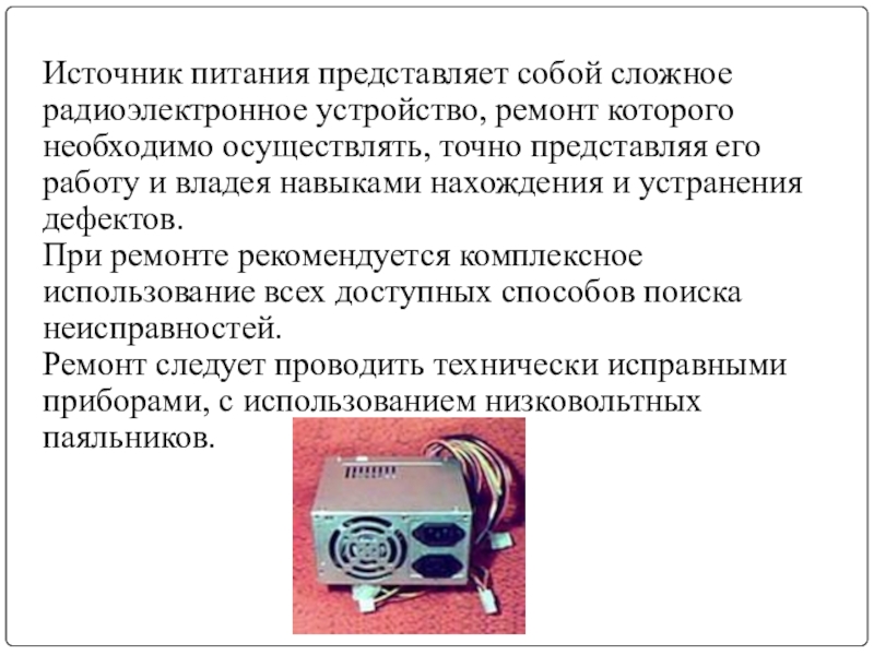 Слайд 2Источник питания представляет собой сложное радиоэлектронное устройство, ремонт которого необходимо осуществлять,