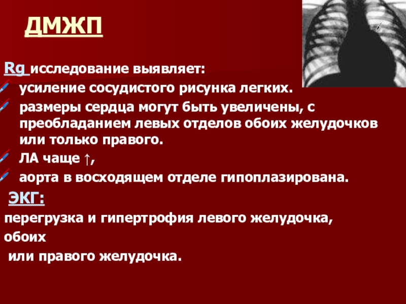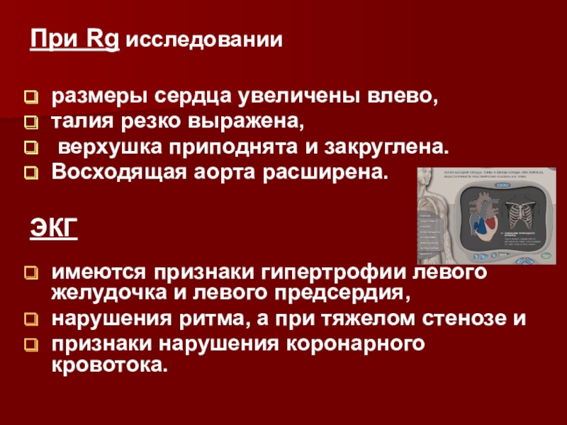 При Rg - кардиомегалия и ↑ размеров левых отделов сердца, застойный сосудистый рисунок легких. Дуга ЛА выбухает. Расширение восходящей части дуги аорты.