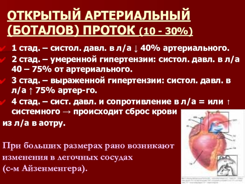 Слайд 10ОТКРЫТЫЙ АРТЕРИАЛЬНЫЙ (БОТАЛОВ) ПРОТОК (10 - 30%)