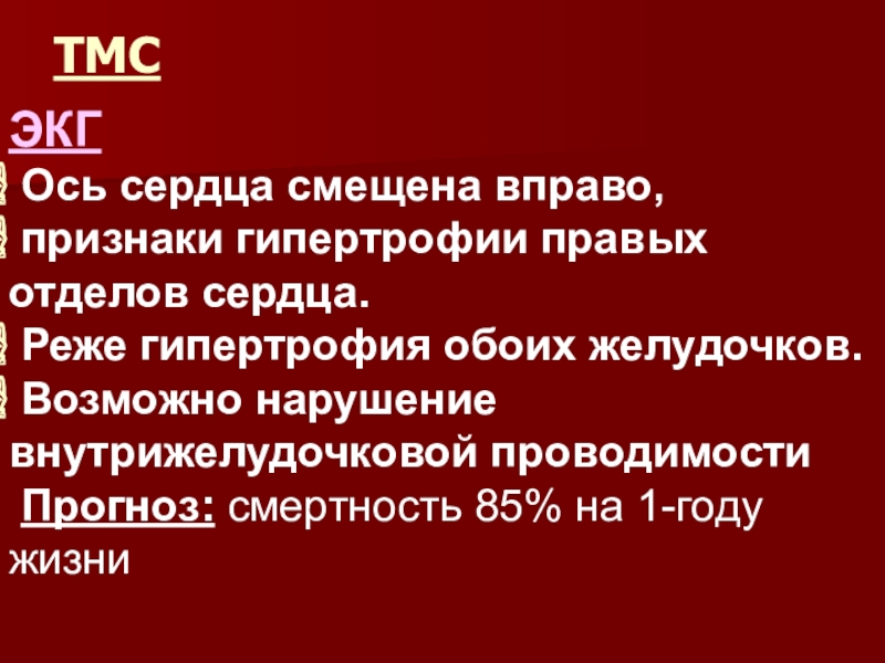 ЭКГ выявляет горизонтальную или смещенную влево электрическую ось сердца, гипертрофию левого или обоих желудочков.