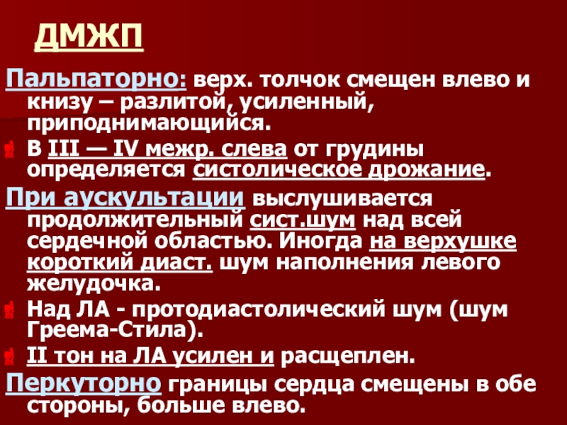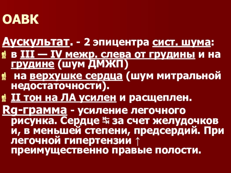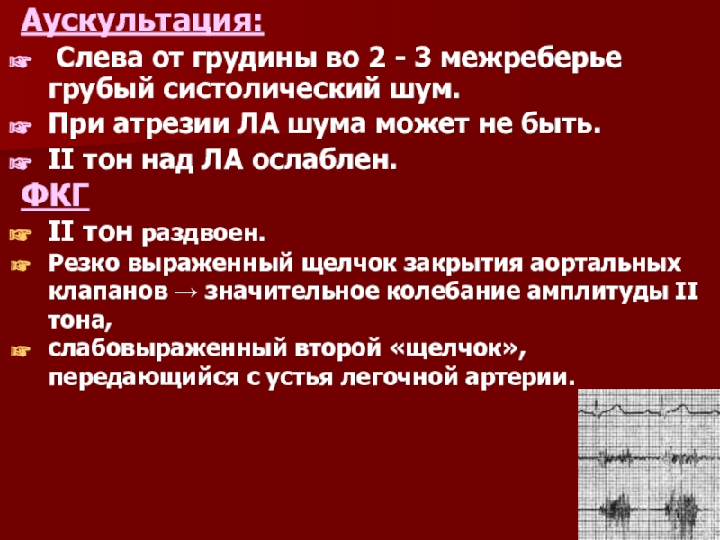 неопределенна: может выслушиваться систолический шум в области II-III грудного позвонка в межлопаточном пространстве, систолодиастолический шум при ОАП либо шум относительной митральной недостаточности. II тон на аорте усилен.