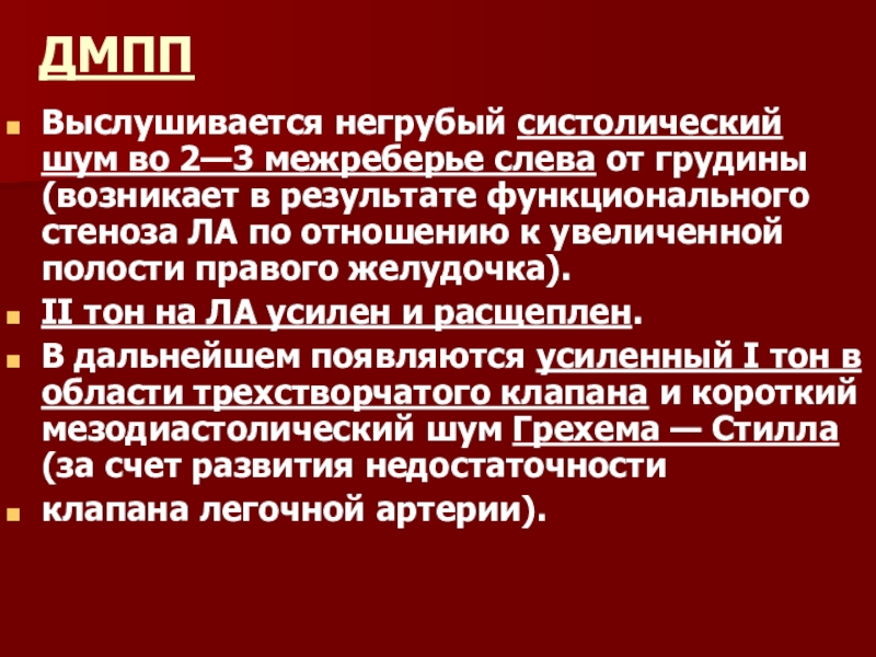 В дальнейшем появляются усиленный I тон в области трехстворчатого клапана и короткий мезодиастолический шум Грехема — Стилла (за счет развития недостаточности