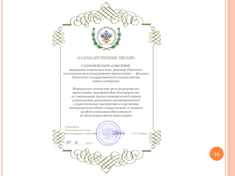 Осуществляла руководство дипломным проектом выдвинутым на грант ОАО «РЖД». Тема дипломного