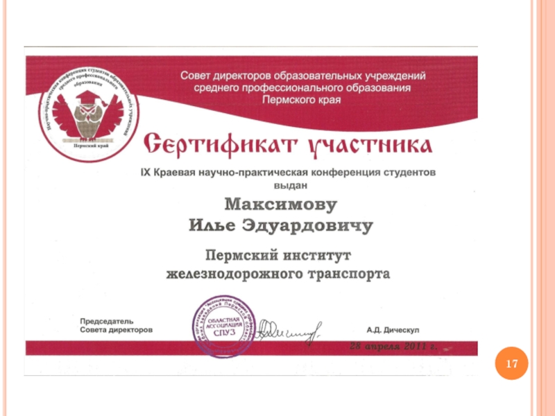 Дипломный проект Максимова И.Э. занял первое место по специальности 190304 «Техническая эксплуатация подвижного состава».