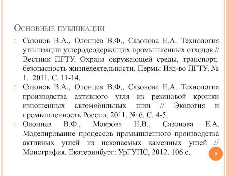 Олонцев В.Ф., Мокрова Н.В., Сазонова Е.А. Моделирование процессов промышленного производства активных углей из ископаемых каменных углей // Монография. Екатеринбург: УрГУПС, 2012. 106 с.