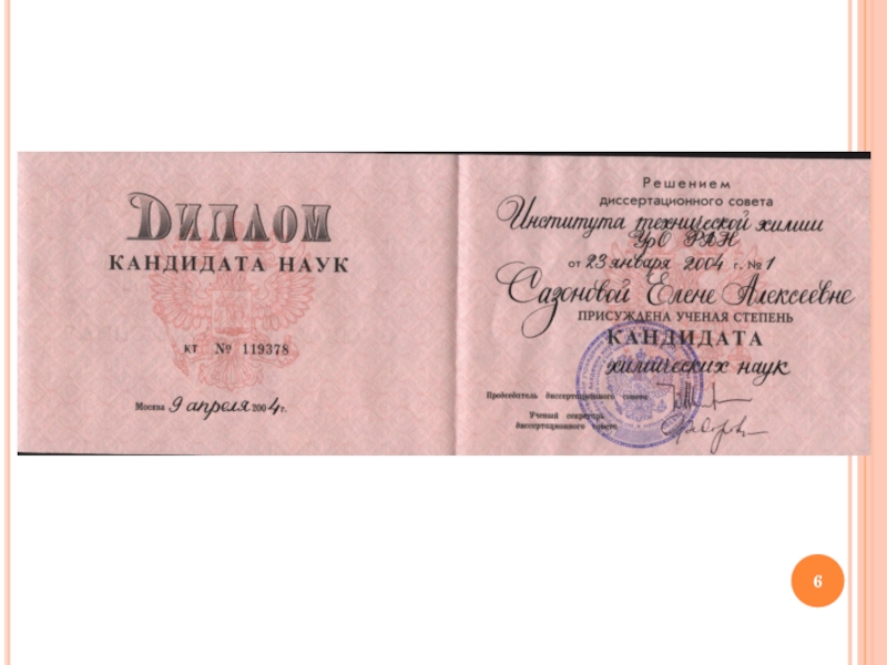 В 2004 г. защитила диссертацию на соискание ученой степени кандидата химических наук по специальности 02.00.04 – физическая химия.
