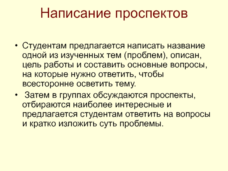 Затем в группах обсуждаются проспекты, отбираются наиболее интересные и предлагается студентам ответить на вопросы и кратко изложить суть проблемы.
