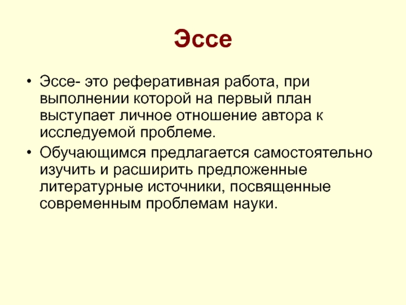 Эссе- это реферативная работа, при выполнении которой на первый план выступает