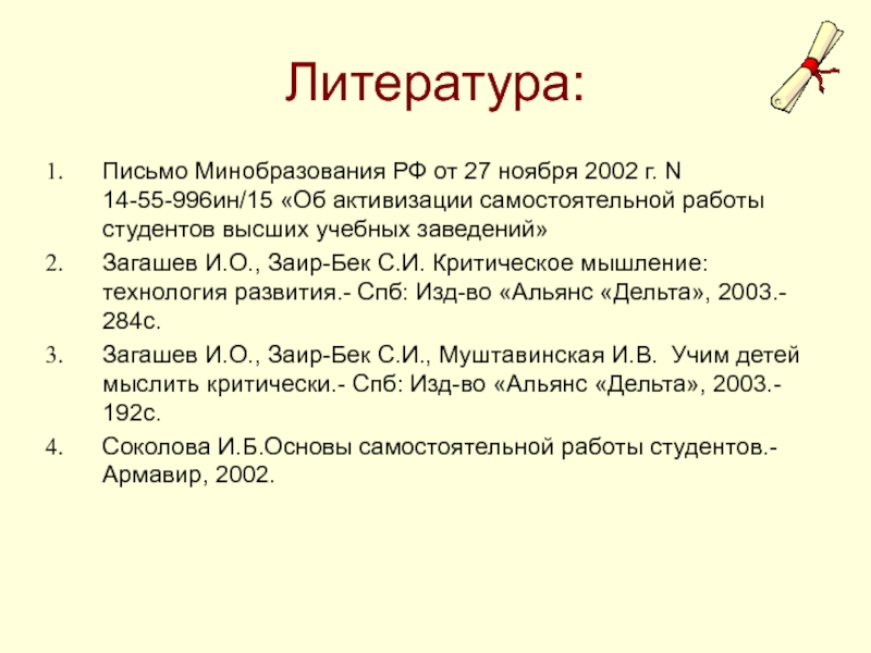 Соколова И.Б.Основы самостоятельной работы студентов.- Армавир, 2002.