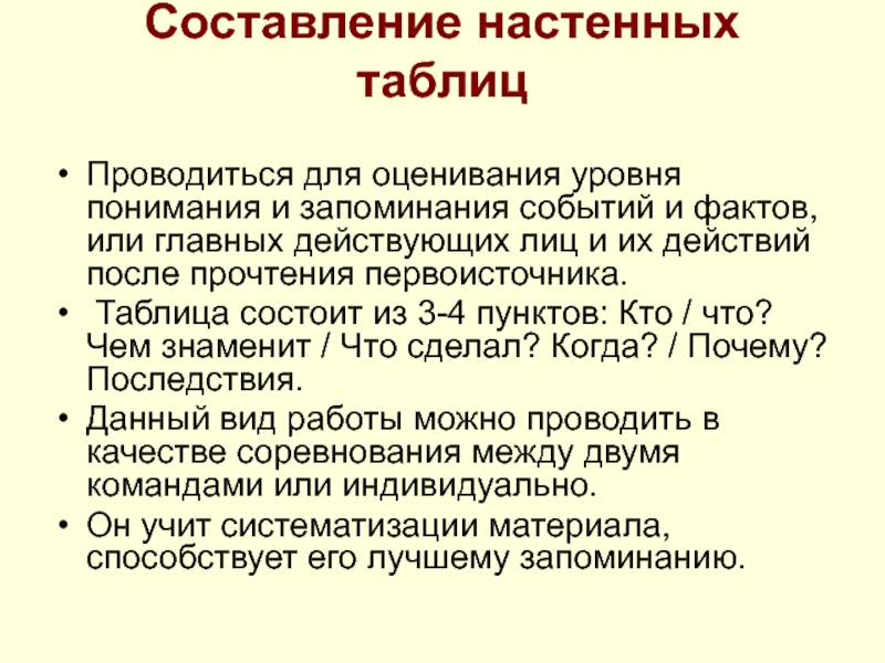 Таблица состоит из 3-4 пунктов: Кто / что? Чем знаменит / Что сделал? Когда? / Почему? Последствия.