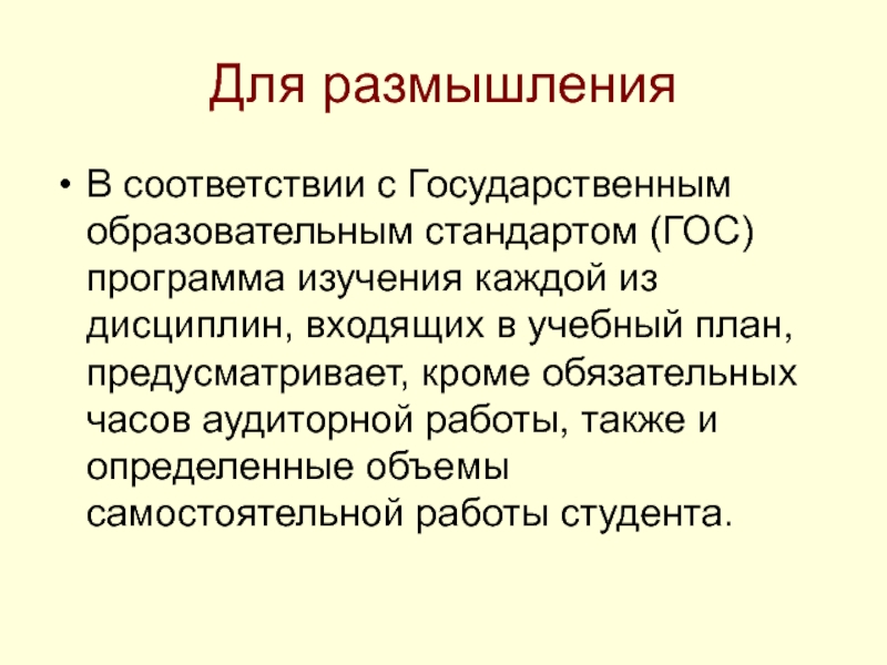 из дисциплин, входящих в учебный план, предусматривает, кроме обязательных часов аудиторной работы, также и определенные объемы самостоятельной работы студента.