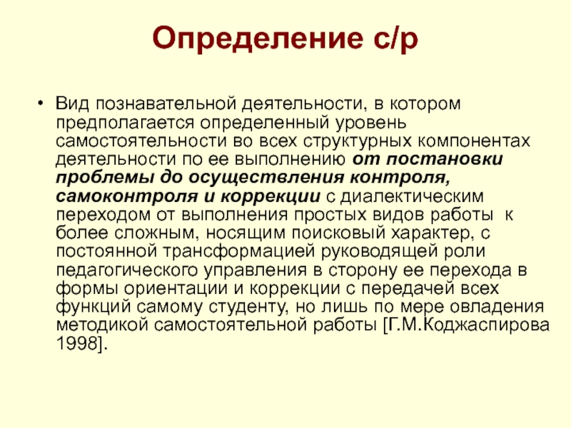 всех структурных компонентах деятельности по ее выполнению от постановки проблемы до осуществления контроля, самоконтроля и коррекции с диалектическим переходом от выполнения простых видов работы к более сложным, носящим поисковый характер, с постоянной трансформацией руководящей роли педагогического управления в сторону ее перехода в формы ориентации и коррекции с передачей всех функций самому студенту, но лишь по мере овладения методикой самостоятельной работы [Г.М.Коджаспирова 1998].