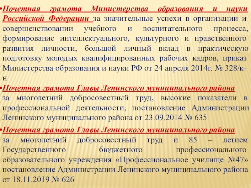 за многолетний добросовестный труд и 85 – летием Государственного бюджетного профессионального образовательного учреждения «Профессиональное училище №47» постановление Администрации Ленинского муниципального района от 18.11.2019 № 626