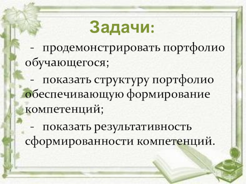 Задачи:	-	продемонстрировать портфолио обучающегося;	- 	показать структуру портфолио обеспечивающую формирование компетенций;	- 	показать результативность сформированности компетенций.