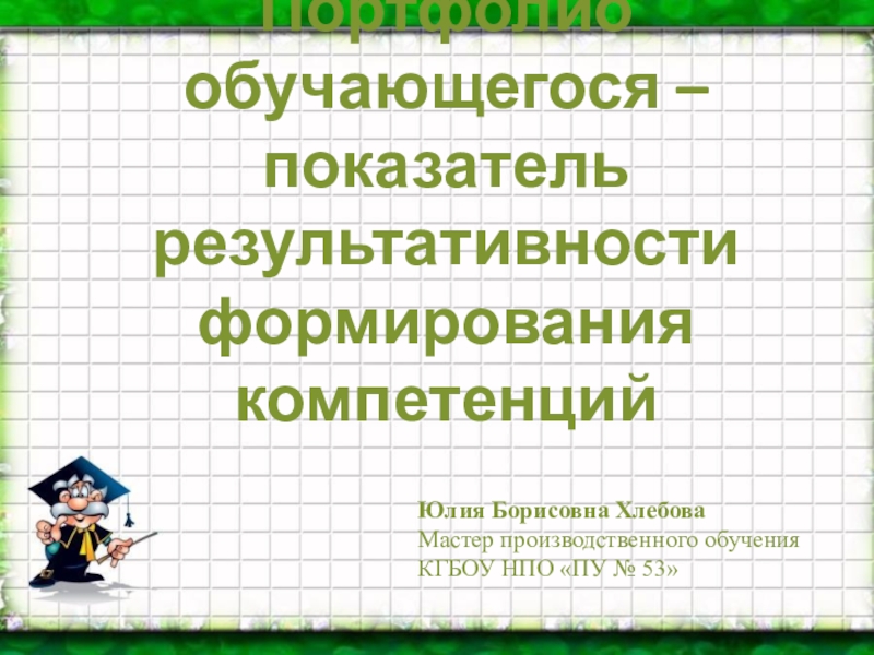 Портфолио обучающегося – показатель результативности формирования компетенцийЮлия Борисовна ХлебоваМастер производственного обучения КГБОУ НПО «ПУ № 53»