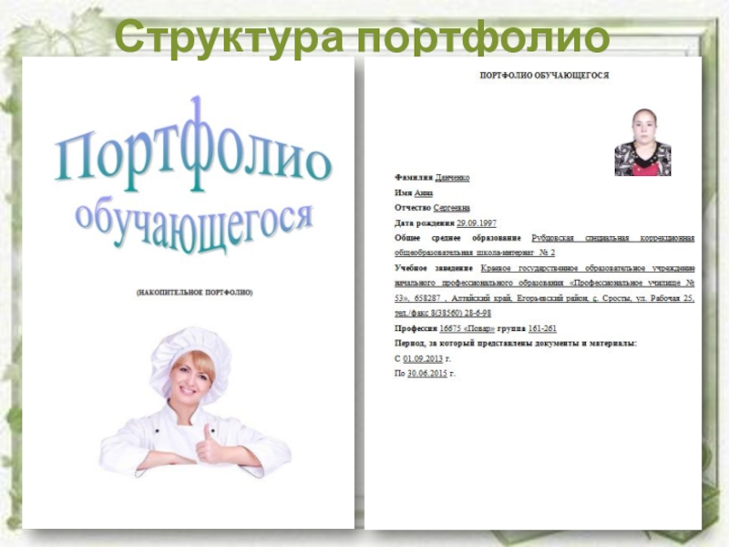 - показать структуру портфолио обеспечивающую формирование компетенций;