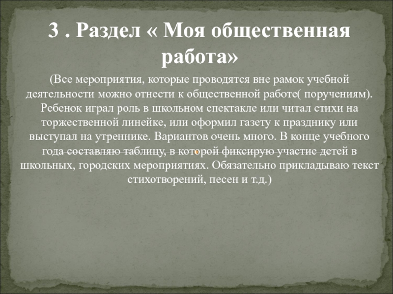 3 . Раздел « Моя общественная работа»(Все мероприятия, которые проводятся вне рамок учебной деятельности можно отнести к