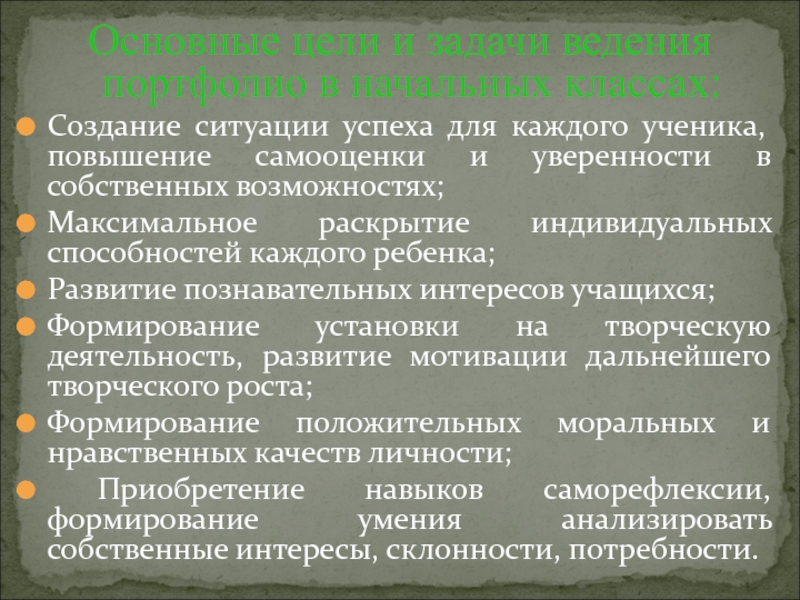 Слайд 5Основные цели и задачи ведения портфолио в начальных классах: