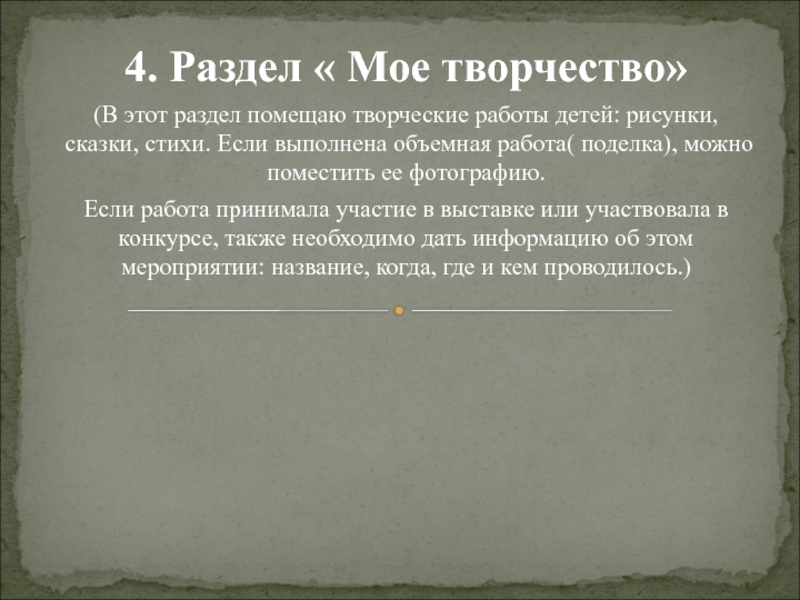 4. Раздел « Мое творчество»(В этот раздел помещаю творческие работы детей: рисунки, сказки, стихи. Если выполнена объемная