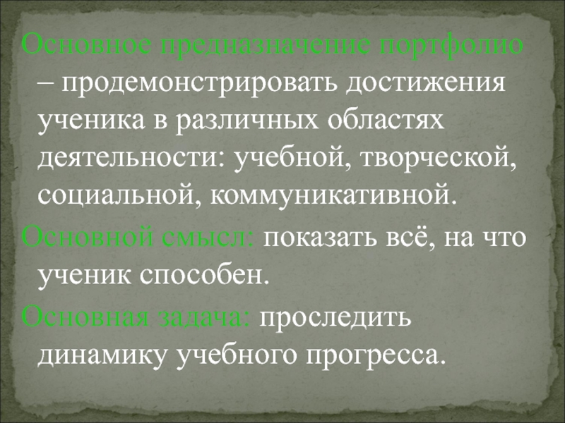 Основное предназначение портфолио – продемонстрировать достижения ученика в различных областях деятельности: учебной, творческой, социальной, коммуникативной.Основной смысл: показать