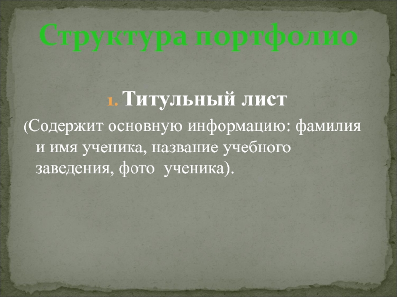 Структура портфолиоТитульный лист(Содержит основную информацию: фамилия и имя ученика, название учебного заведения, фото  ученика).