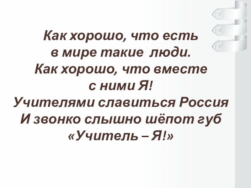 Как хорошо, что есть в мире такие люди.Как хорошо, что вместе с ними Я!Учителями славиться РоссияИ звонко