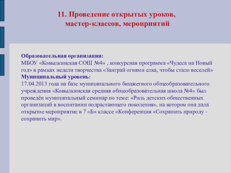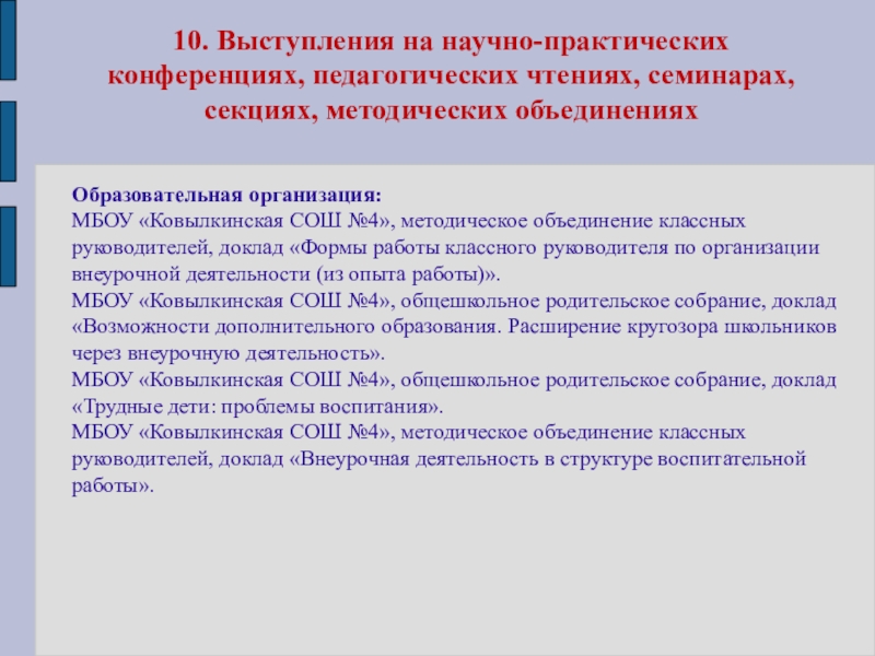 МБОУ «Ковылкинская СОШ №4», методическое объединение классных руководителей, доклад «Формы работы классного руководителя по организации внеурочной деятельности (из опыта работы)».