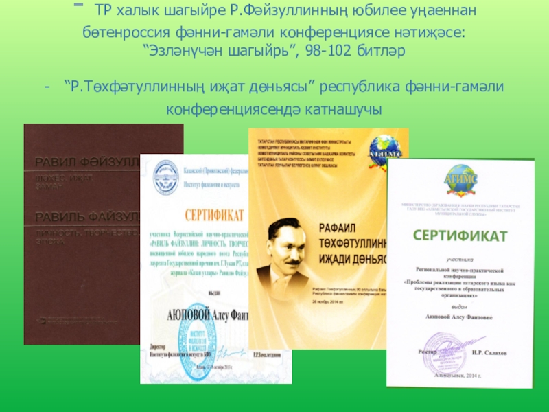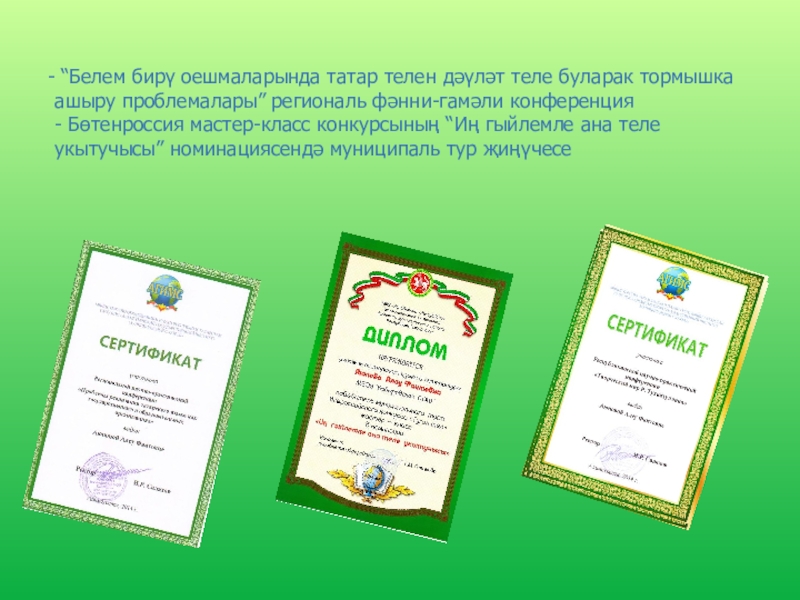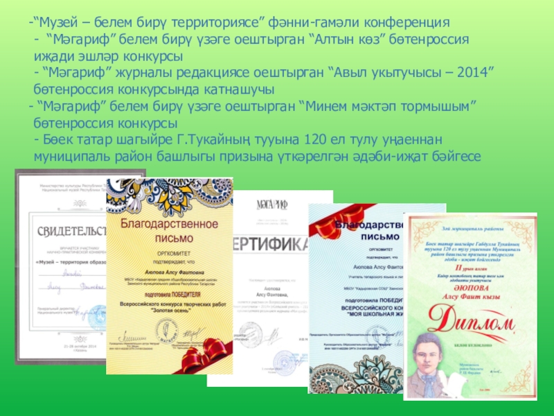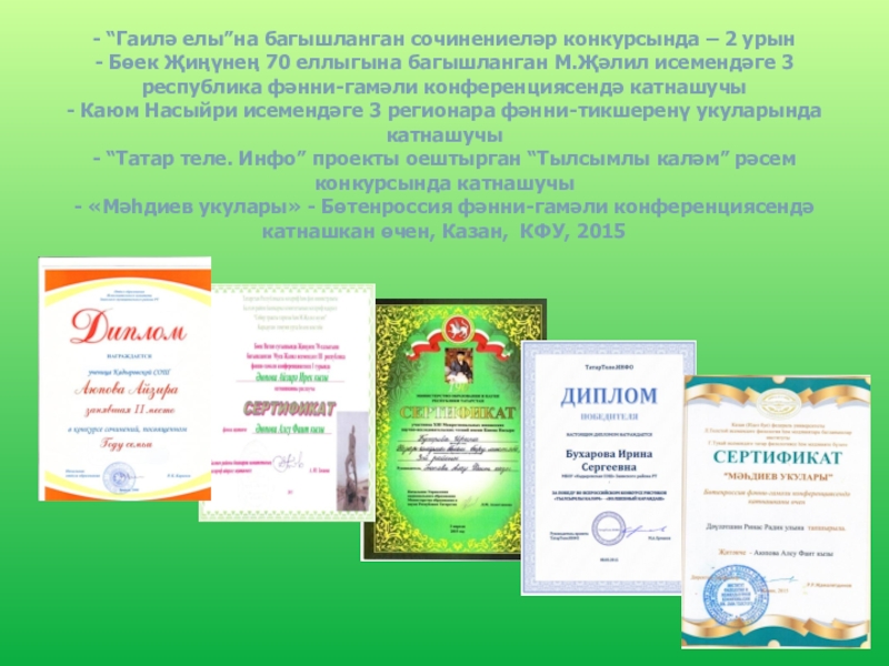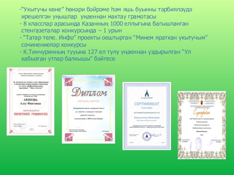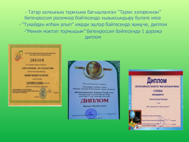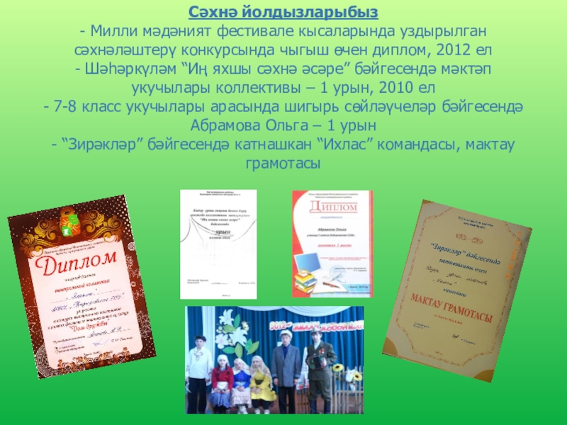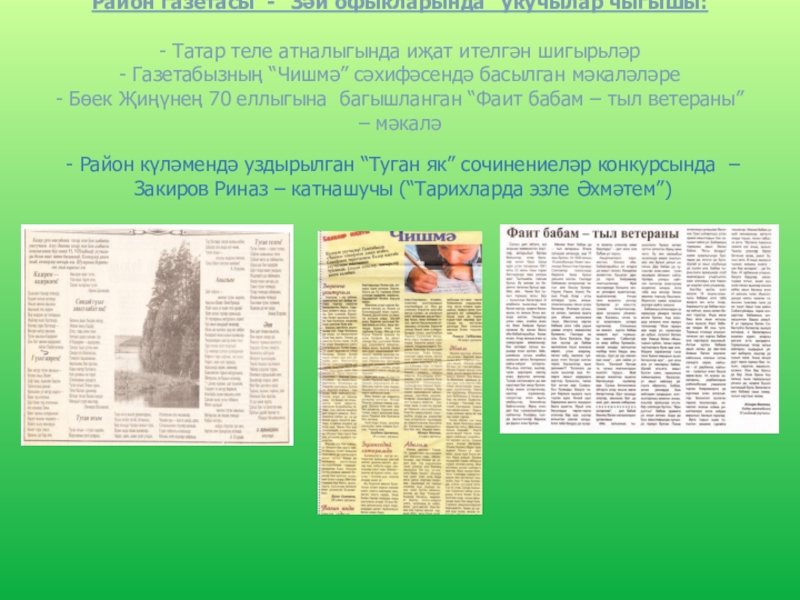 - Район күләмендә уздырылган “Туган як” сочинениеләр конкурсында – Закиров Риназ – катнашучы (“Тарихларда эзле Әхмәтем”)