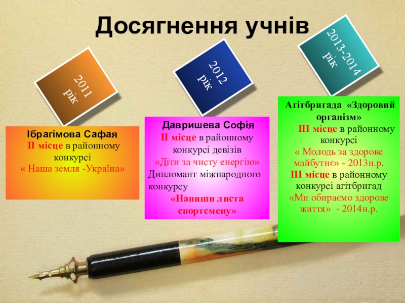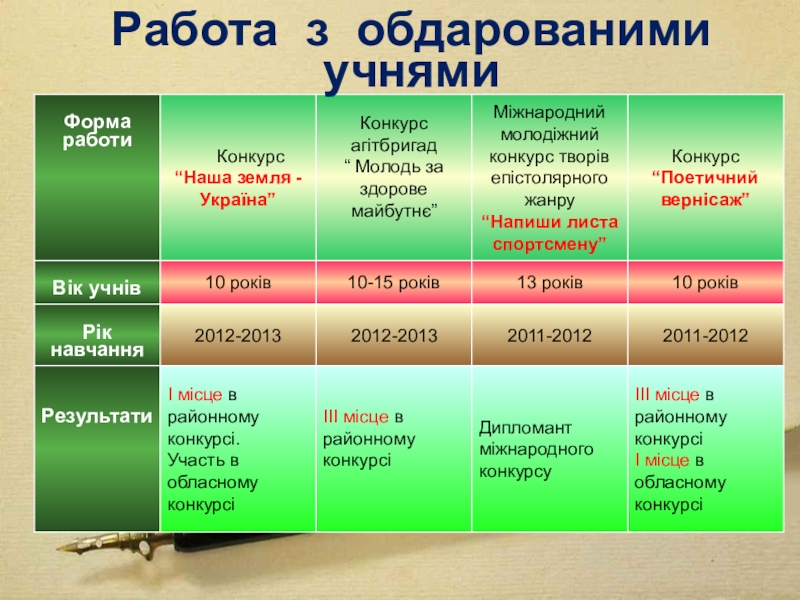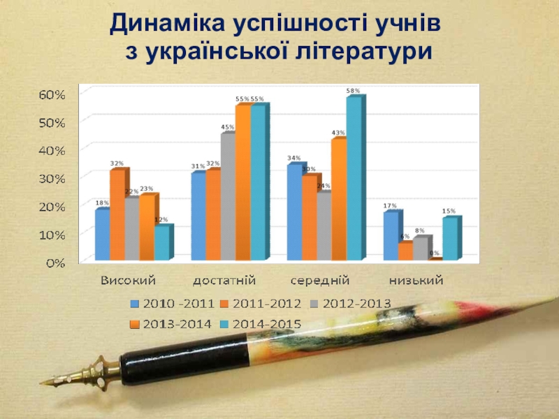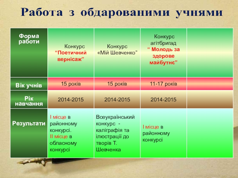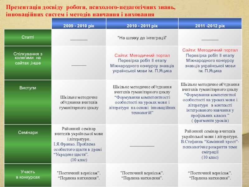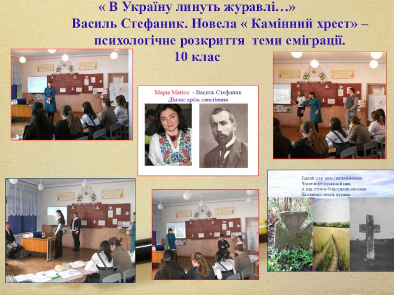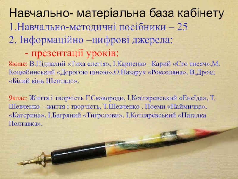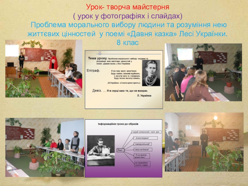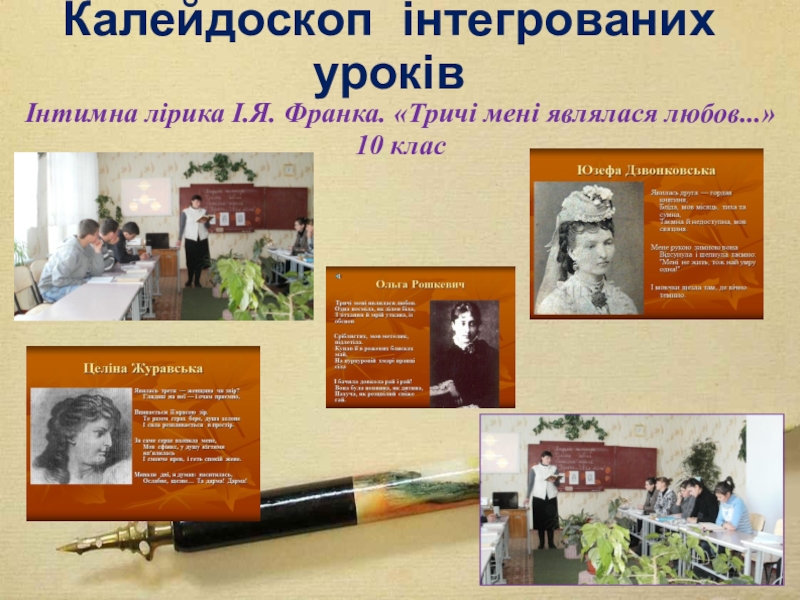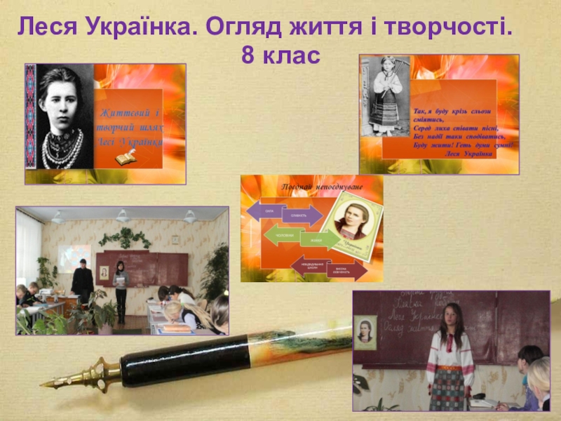 І.Карпенко –Карий –життєвий і творчий шлях, «Мартин Боруля». М.Старицький .Життєвий і творчий шлях, І.Франко .Творчість поета – 8 презентацій,М.Коцюбинський – 4 презентації, О.Кобилянська «Людина»-2 презентації, В.Стефаник «Камінний хрест» – 2 презентації, Л.Українка .Творчість, поезія,драми -10 презентацій, М.Вороний -5 презентацій (творчі роботи учнів), О.Олесь – 2 презентації.