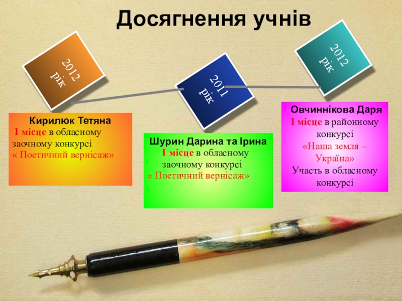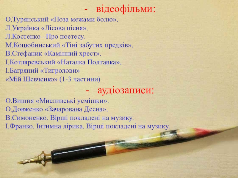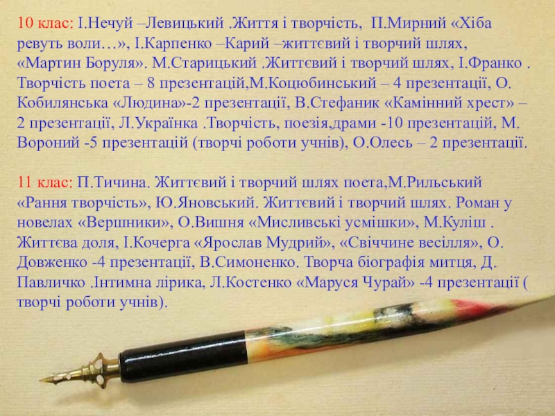 11 клас: П.Тичина. Життєвий і творчий шлях поета,М.Рильський «Рання творчість», Ю.Яновський. Життєвий і творчий шлях. Роман у новелах «Вершники», О.Вишня «Мисливські усмішки», М.Куліш .Життєва доля, І.Кочерга «Ярослав Мудрий», «Свіччине весілля», О.Довженко -4 презентації, В.Симоненко. Творча біографія митця, Д.Павличко .Інтимна лірика, Л.Костенко «Маруся Чурай» -4 презентації ( творчі роботи учнів).