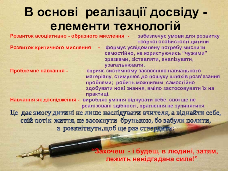 Слайд 17В основі реалізації досвіду - елементи технологій