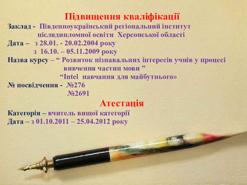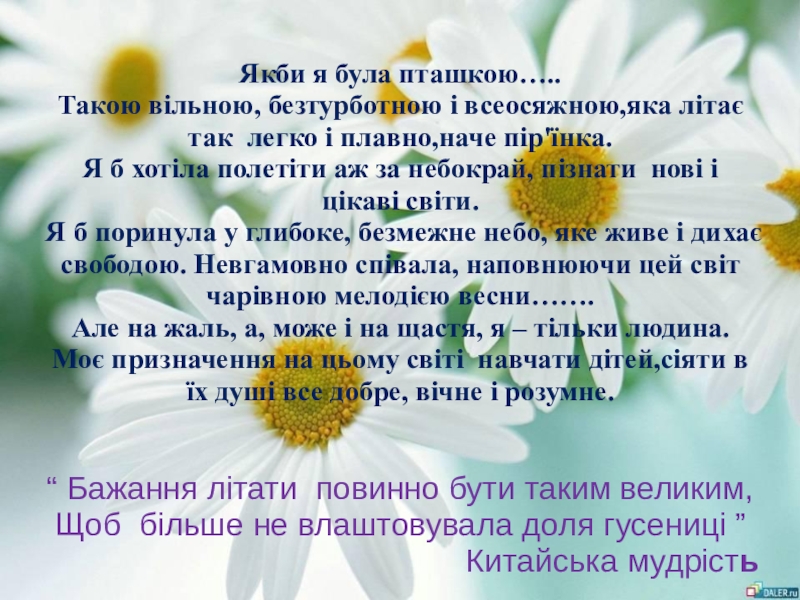 Але на жаль, а, може і на щастя, я – тільки людина. Моє призначення на цьому світі навчати дітей,сіяти в їх душі все добре, вічне і розумне.