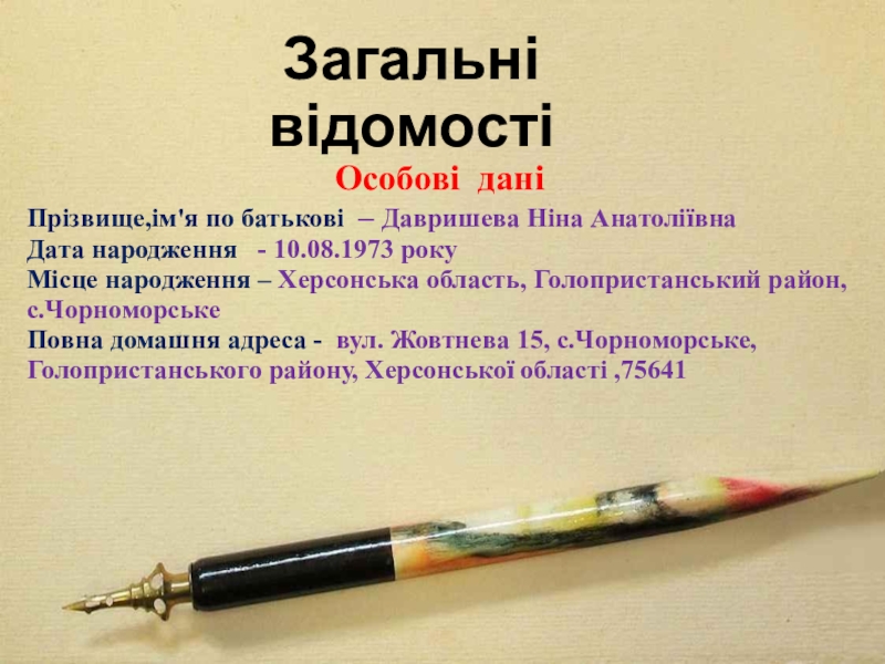 Повна домашня адреса - вул. Жовтнева 15, с.Чорноморське, Голопристанського району, Херсонської області ,75641