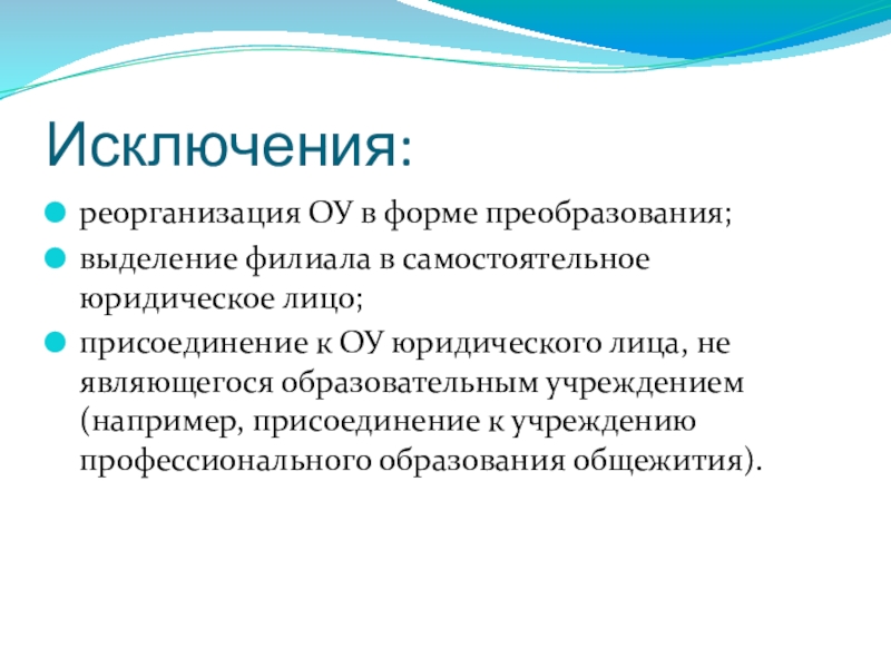 Все иные варианты изменения правового статуса образовательных организаций не являются реорганизацией.