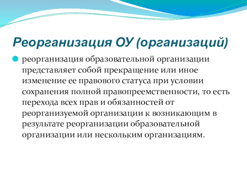 ее правового статуса при условии сохранения полной правопреемственности, то есть перехода всех прав и обязанностей от реорганизуемой организации к возникающим в результате реорганизации образовательной организации или нескольким организациям.