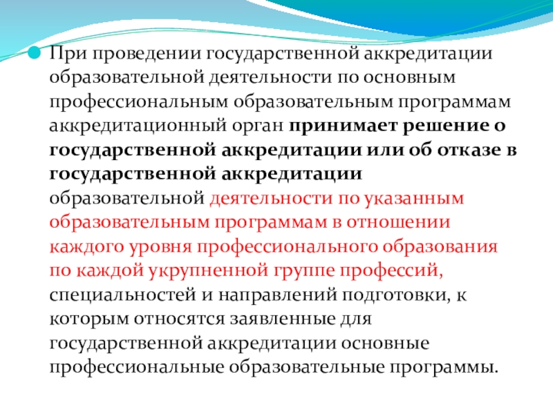 аккредитационный орган принимает решение о государственной аккредитации или об отказе в государственной аккредитации образовательной деятельности по указанным образовательным программам в отношении каждого уровня профессионального образования по каждой укрупненной группе профессий, специальностей и направлений подготовки, к которым относятся заявленные для государственной аккредитации основные профессиональные образовательные программы.