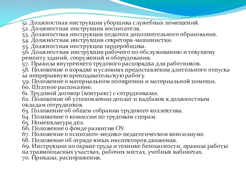 69. Инструкции по охране труда и технике безопасности, правила работы на травмоопасных участках, рабочих местах, учебных кабинетах.