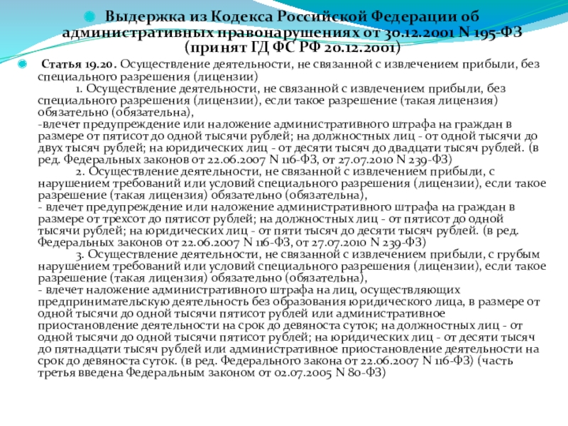 Слайд 15Выдержка из Кодекса Российской Федерации об административных правонарушениях от 30.12.2001 N