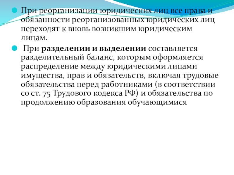 При разделении и выделении составляется разделительный баланс, которым оформляется распределение между юридическими лицами имущества, прав и обязательств, включая трудовые обязательства перед работниками (в соответствии со ст. 75 Трудового кодекса РФ) и обязательства по продолжению образования обучающимися