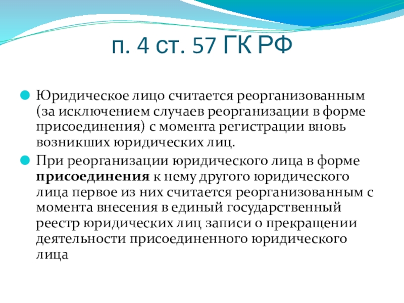 При реорганизации юридического лица в форме присоединения к нему другого юридического лица первое из них считается реорганизованным с момента внесения в единый государственный реестр юридических лиц записи о прекращении деятельности присоединенного юридического лица