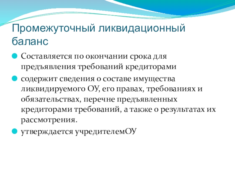 сведения о составе имущества ликвидируемого ОУ, его правах, требованиях и обязательствах, перечне предъявленных кредиторами требований, а также о результатах их рассмотрения.