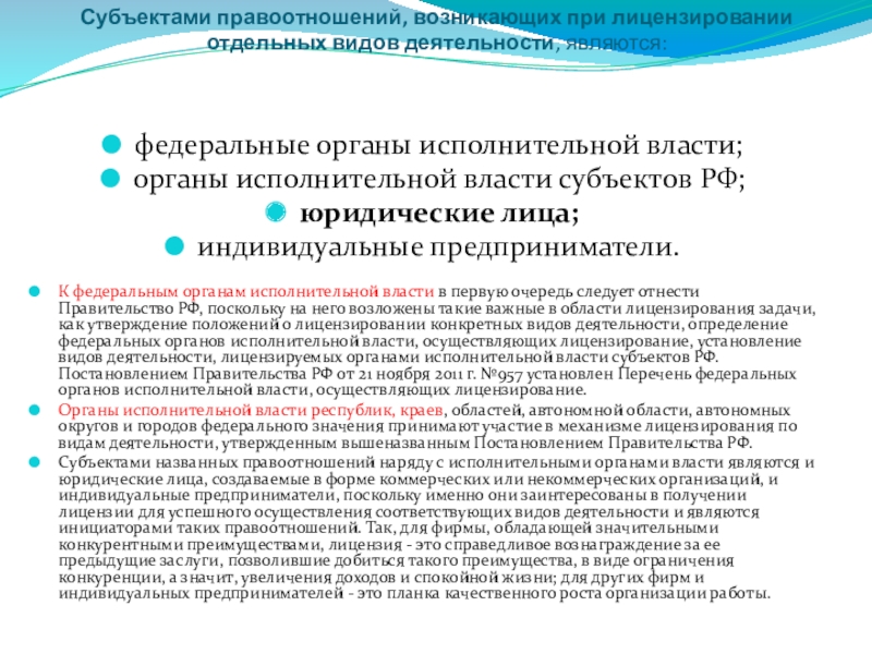 К федеральным органам исполнительной власти в первую очередь следует отнести Правительство РФ, поскольку на него возложены такие важные в области лицензирования задачи, как утверждение положений о лицензировании конкретных видов деятельности, определение федеральных органов исполнительной власти, осуществляющих лицензирование, установление видов деятельности, лицензируемых органами исполнительной власти субъектов РФ. Постановлением Правительства РФ от 21 ноября 2011 г. №957 установлен Перечень федеральных органов исполнительной власти, осуществляющих лицензирование.